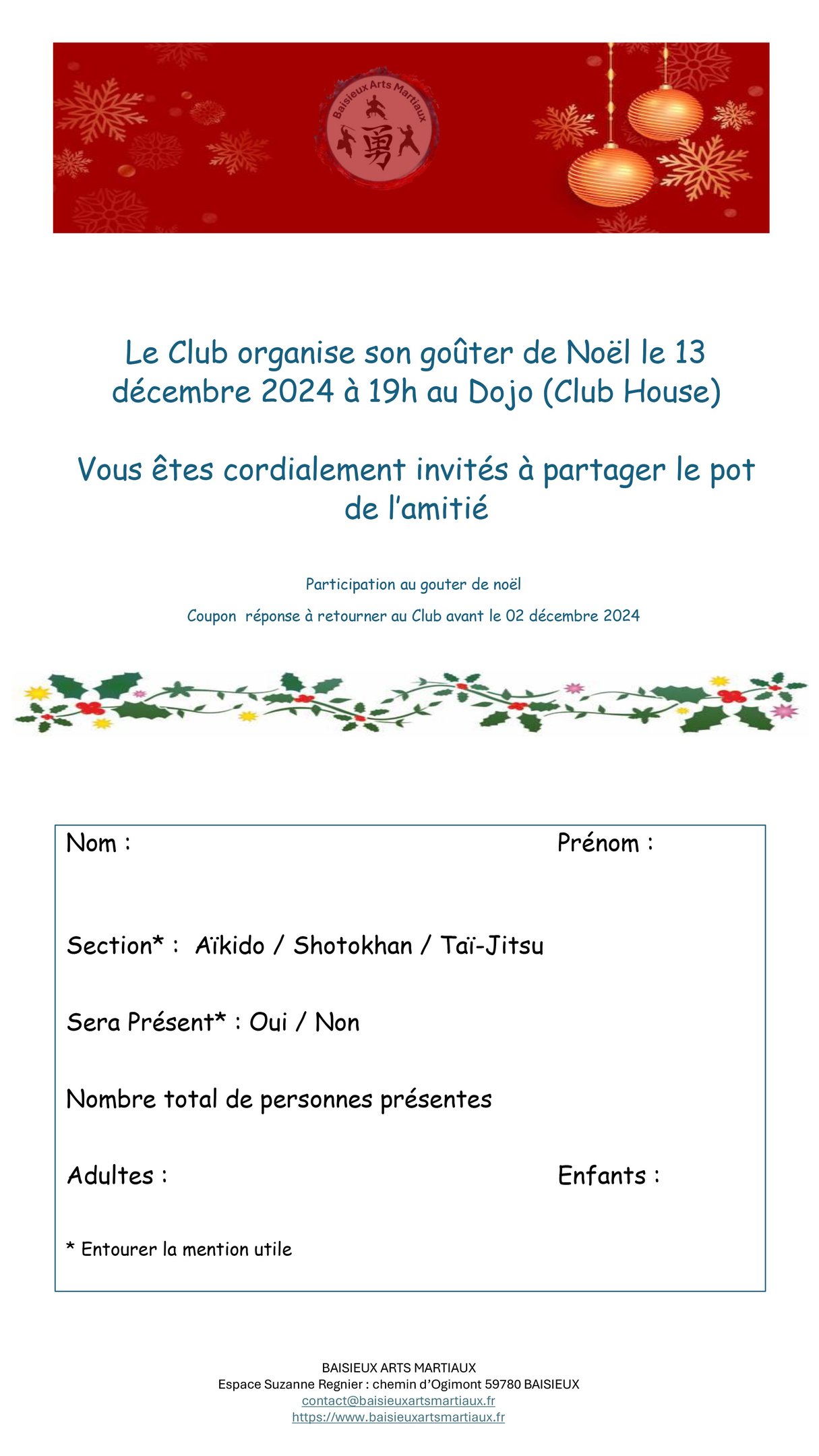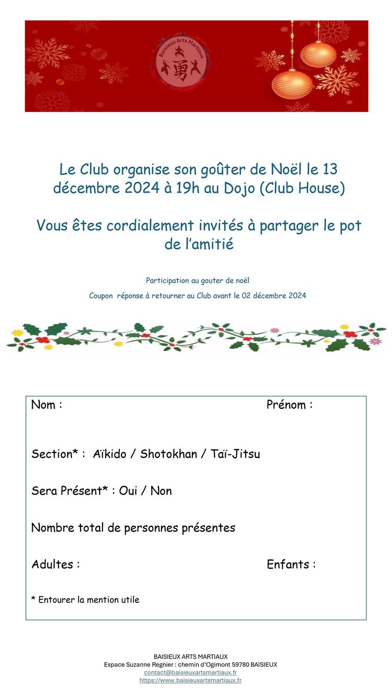 Nous vous attendons nombreux pour célébrer ensemble autour de gourmandises de saison et d’un esprit de camaraderie qui fait la richesse de notre club. Que vous soyez pratiquant, parent ou simple amateur d’arts martiaux, ce rendez-vous est l’occasion parfaite de partager un moment privilégié en dehors du tatami.
