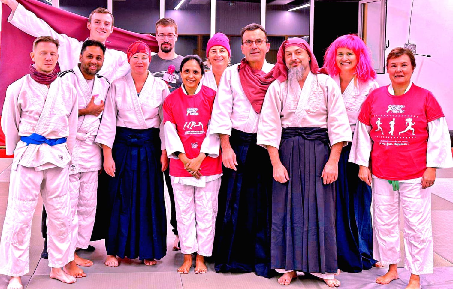 Dans un bel élan de solidarité, notre section a tenu à marquer son engagement par une photo collective symbolique. Sur cette image, nos pratiquants, unis par les valeurs de l’Aïkido, portent fièrement des touches de rose, couleur emblématique de la cause. Ce geste, aussi simple que fort, traduit notre soutien à toutes les personnes qui luttent ou ont lutté contre le cancer du sein.